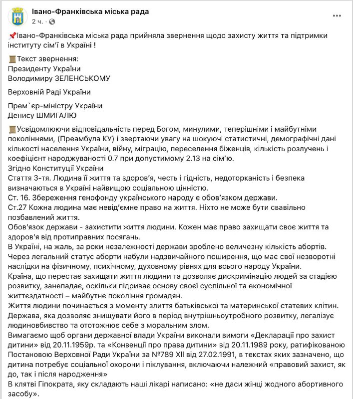 Івано-Франківська міська рада ухвалила звернення до Володимира Зеленського, Верховної Ради та прем'єр-міністра Дениса Шмигаля про захист життя та підтримку інституту сім'ї в Україні. Міськрада закликає владу країни "на законодавчому рівні захистити життя ненароджених дітей та закріпити це у Конституції України". Іншими словами – заборонити аборти.