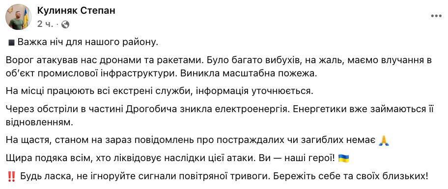 09:23 Приліт на Львівщині був у Дрогобицькому районі, заявив його голова Степан Кулиняк.