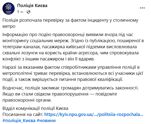 "Поліція розпочала перевірку за фактом інциденту в столичному метро. Інформацію про те, що сталося, правоохоронці виявили вчора під час моніторингу соціальних мереж", - йдеться у повідомленні.