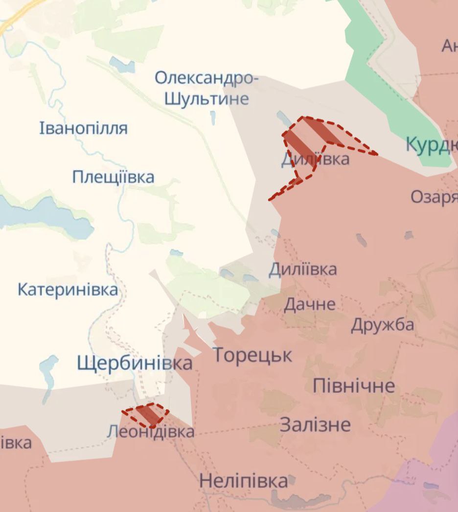 Як повідомляє Deep State, вони також просунулися під Торецьком у районі Леонідівки та Диліївки (бої ведуться у селі Олександро-Шультино).