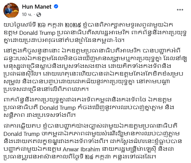 "Після розмови з виконувачем обов'язків прем'єр-міністра Таїланду Його ясновельможністю Пхумтамом Вечачаєм, шановний президент Дональд Трамп повідомив мені позитивну новину про те, що тайська сторона також погодилася на пропозицію високоповажного президента про негайне припинення вогню. Це позитивна новина для солдатів і народів обох країн", - написав він.