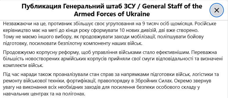 "Противник збільшує своє угруповання на 9 тисяч осіб щомісяця. Російське керівництво має на меті до кінця року сформувати 10 нових дивізій, дві вже створено. Тому немає іншого вибору, як продовжувати заходи мобілізації, покращувати бойову підготовку, посилювати безпілотну компоненту наших військ", – повідомив Сирський.