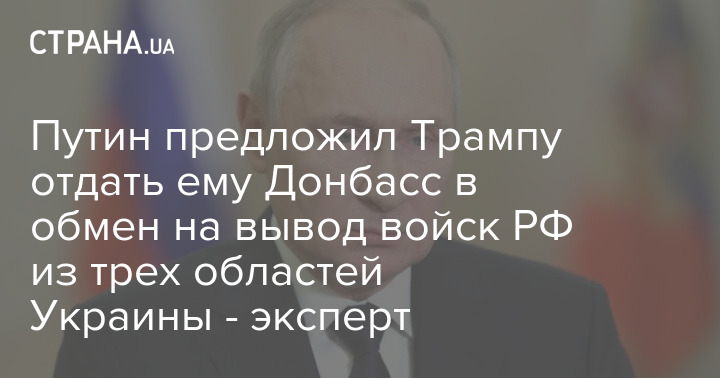 Російський лідер Володимир Путін пропонує президенту США Дональду Трампу відведення ЗСУ з Донбасу в обмін на вихід російських військ із трьох областей України – Сумської, Харківської та Дніпропетровської.