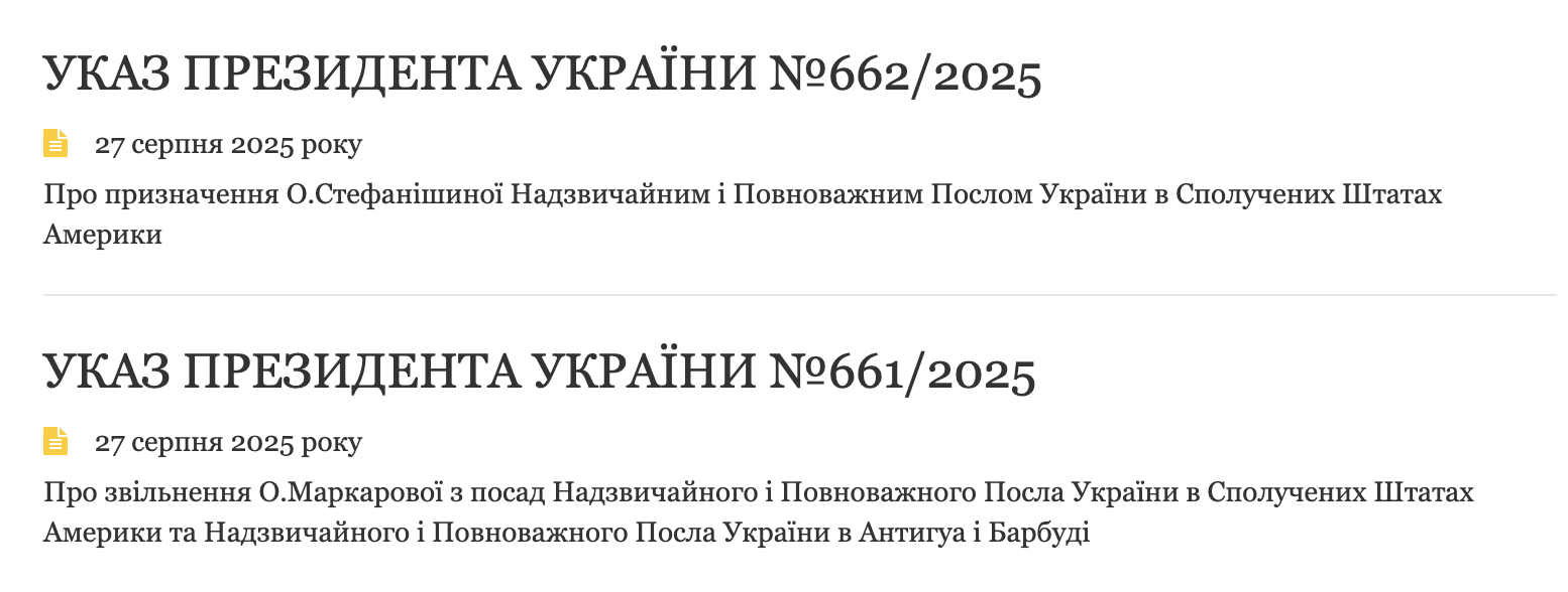 Президент Володимир Зеленський підписав укази про звільнення Оксани Маркарової з посади посла України у США та призначення на її місце колишньої віце-прем'єрки Ольги Стефанішиної.