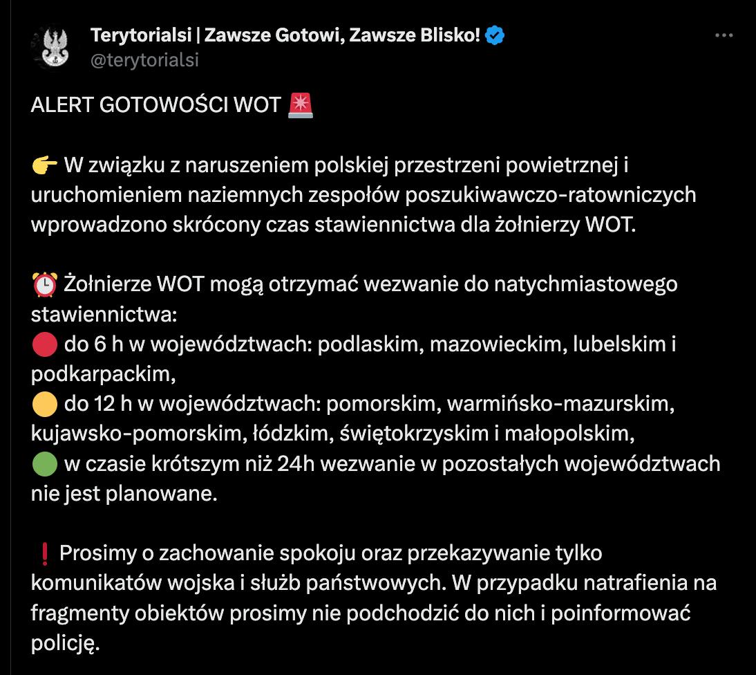 "Польські та союзні засоби радіолокаційно відслідковували кілька десятків об'єктів, а стосовно тих, які могли становити загрозу, Оперативний командувач прийняв рішення про їх нейтралізацію. Частину дронів, що вторглися в наш повітряний простір, було збито. Продовжується пошук і встановлення місць можливого падіння цих об'єктів",
