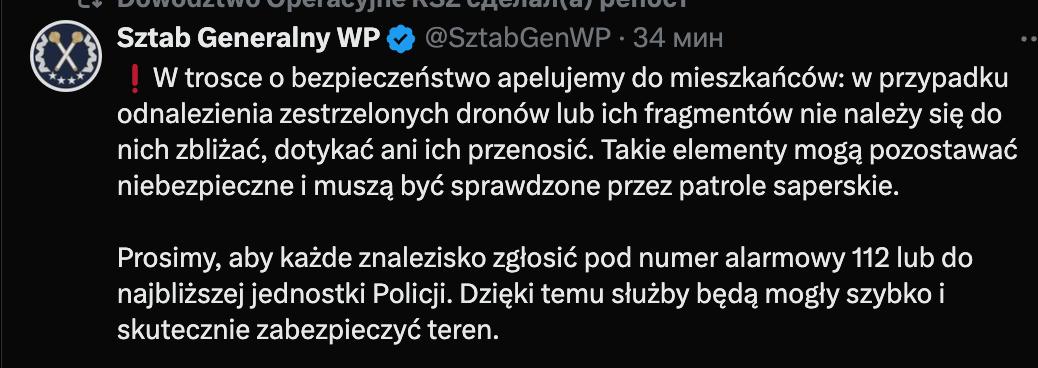 "Під час сьогоднішньої атаки Російської Федерації, що завдає ударів по об'єктах, що знаходяться на території України, наш повітряний простір неодноразово порушувався об'єктами типу дрон. Ведеться операція, метою якої є ідентифікація і нейтралізація цих об'єктів. За наказом Оперативного командувача ЗС Польщі було застосовано озброєння.