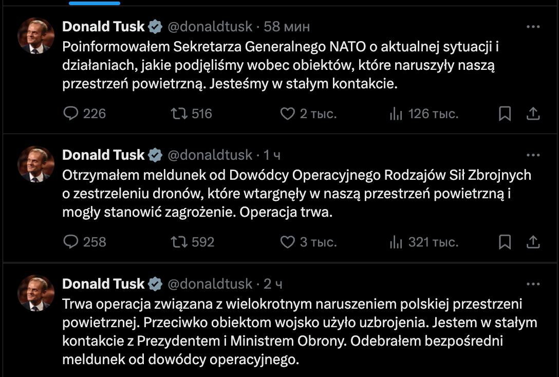 Сам Туск уже заявив, що проінформував "генсека НАТО про поточну ситуацію та заходи, які ми вжиті щодо об'єктів, що порушили наш повітряний простір".