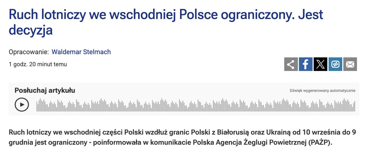 Влада Польщі обмежила авіаційне сполучення у східній частині країни біля кордону з Україною та Білоруссю.
