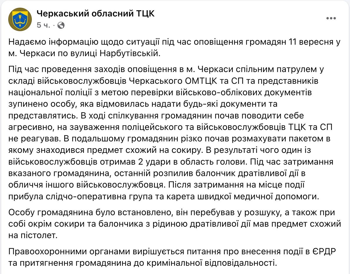 У Черкасах чоловік ударив сокирою по голові військкомів, які зупинили його для перевірки документів. Також він розпорошив у співробітників ТЦК газовий балончик.