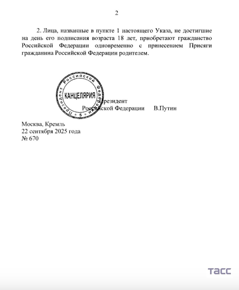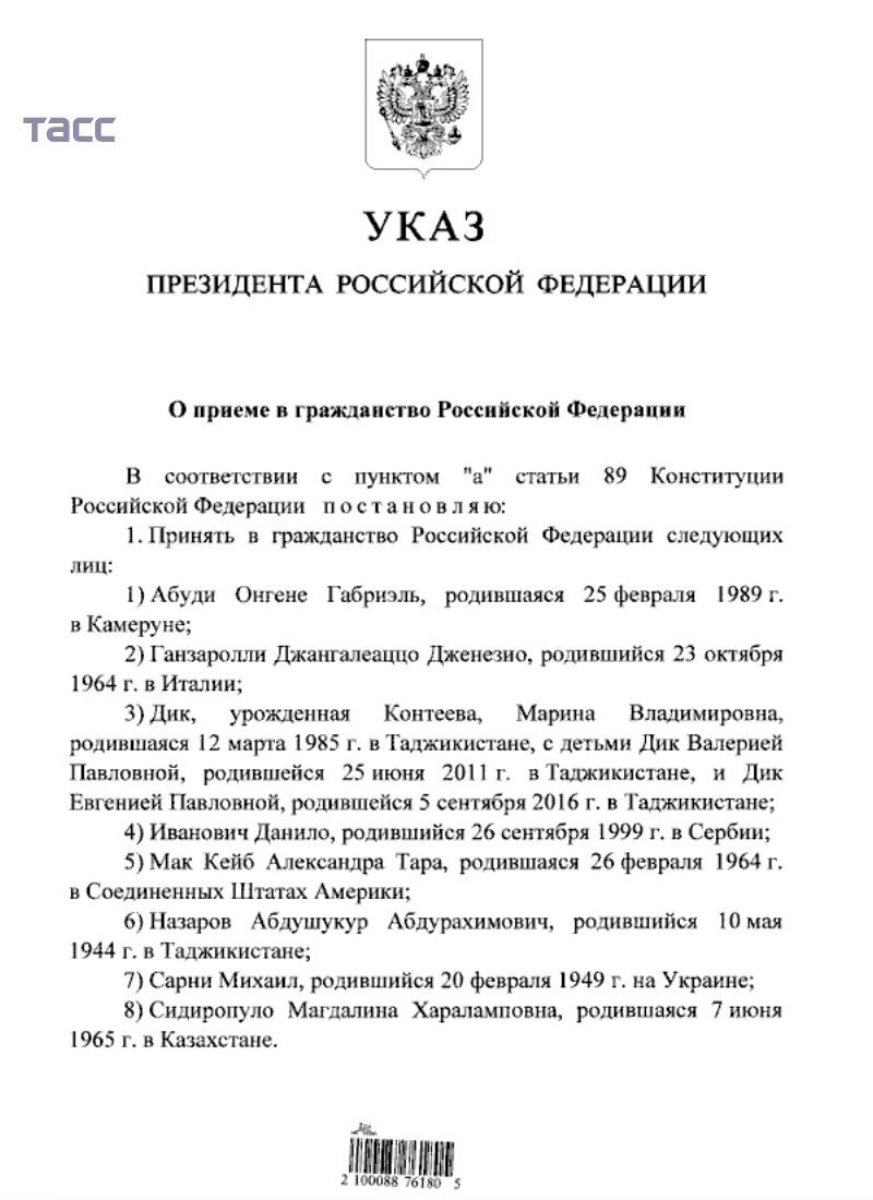 "Прийняти в громадянство Росії МакКейб Олександра Тара, яка народилася 26 лютого 1964 року в Сполучених Штатах Америки", - йдеться в документі.