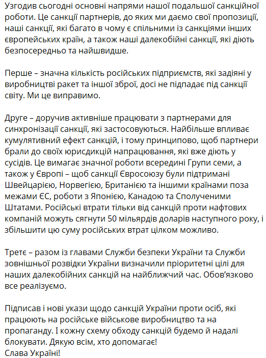 "Разом із головами Служби безпеки України та Служби зовнішньої розвідки України визначили пріоритетні цілі для наших дальнобійних санкцій на найближчий час. Обов'язково все реалізуємо", - заявив президент.