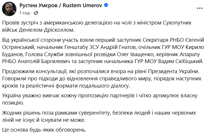"Продовжили консультації, розпочаті вчора на рівні президента України. Говорили про підходи до відновлення справедливого світу, порядок подальших кроків та реалістичні формати подальшого діалогу. Україна уважно вивчає кожну пропозицію партнерів і чітко артикулює свою позицію. Жодних рішень поза суверенітетом, безпекою людей і наших червоних. обговорень", - заявив Умеров.