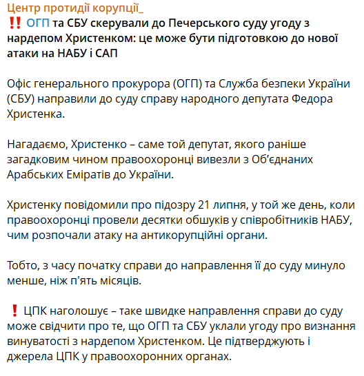 "Христенко повідомили про підозру 21 липня, того ж дня, коли правоохоронці провели десятки обшуків у співробітників НАБУ, чим почали атаку на антикорупційні органи. Тобто з часу початку справи до направлення її до суду пройшло менше п'яти місяців. Такий швидкий напрямок справи до суду може свідчити про те, що ОГП і СБУ уклали угоду і СБУ. ЦПК у правоохоронних органах", – йдеться у повідомленні Центру протидії корупції.