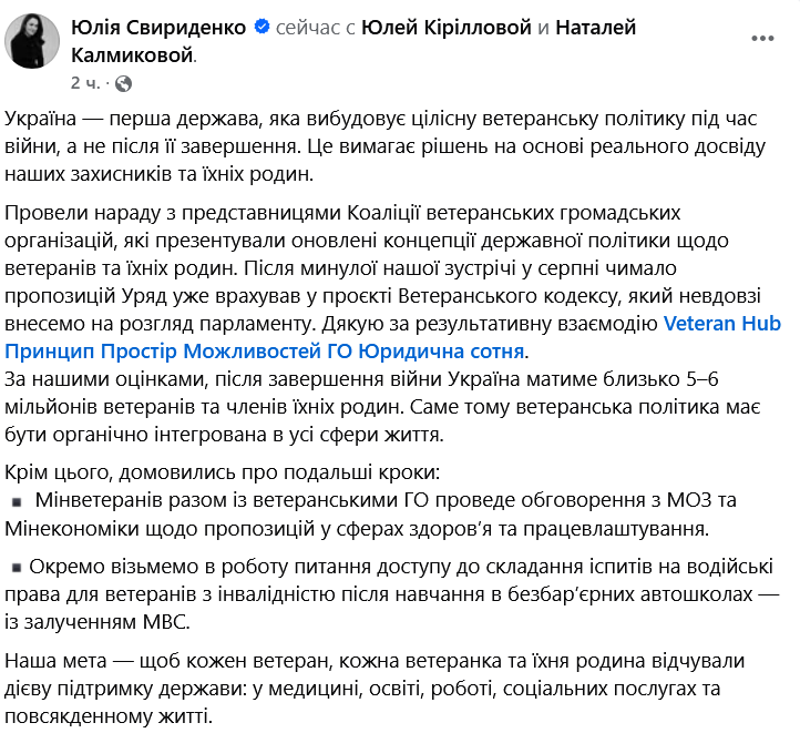 Свириденко додала, що багато пропозицій уже враховано у проекті Ветеранського кодексу, який найближчим часом буде внесено на розгляд парламенту.
