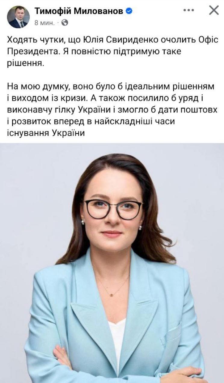 "Ходять чутки, що Юлія Свириденко очолить Офіс Президента. Я повністю підтримую таке рішення. На мій погляд, це було б ідеальним рішенням і виходом із кризи. А також посилило б уряд та виконавчу гілку України", - написав Мілованов.