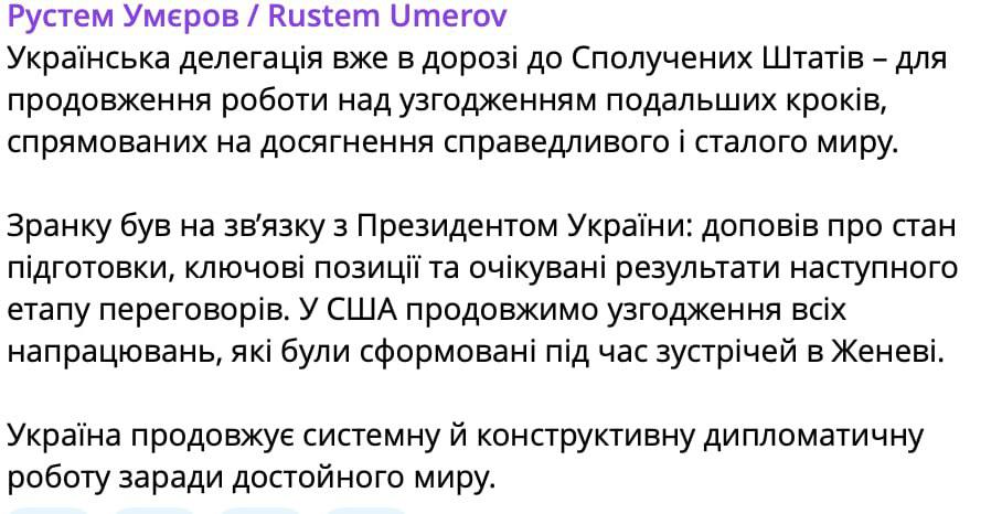 "Українська делегація вже в дорозі до Сполучених Штатів – для продовження роботи над узгодженням подальших кроків, спрямованих на досягнення справедливого та сталого світу", - йдеться у повідомленні.