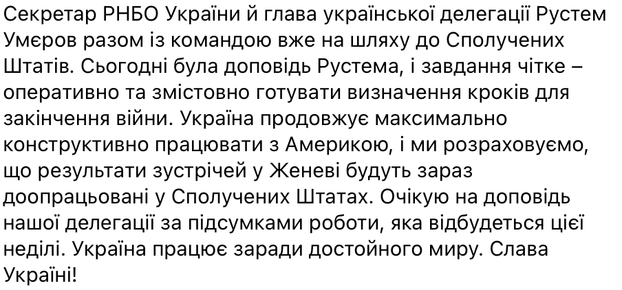 "Сьогодні була доповідь Рустема, і завдання чітке - оперативно та змістовно підготувати визначення кроків для завершення війни. Україна продовжує максимально конструктивно працювати з Америкою, і ми розраховуємо, що результати зустрічей у Женеві будуть зараз доопрацьовані в Сполучених Штатах.