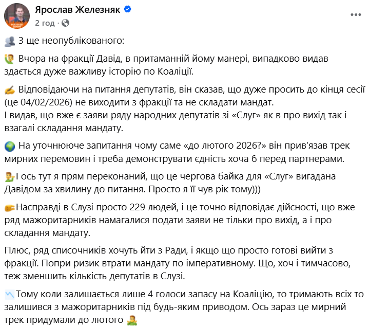Желєзняк упевнений, що Арахамія намагається уникнути втрати монобільшості, в якій залишилося 229 депутатів при мінімумі 226. Притому депутати-списочники, які бажають залишити фракцію, готові до того, що доведеться покинути і Раду, стверджує нардеп.
