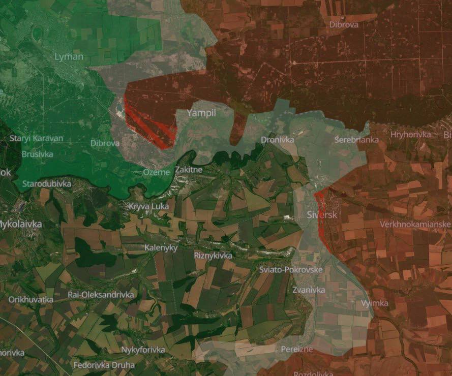 Крім того, армія РФ просунулась біля Ямполя та Сіверська. Практично вся територія цих населених пунктів, згідно з картою DeepState, знаходиться під контролем росіян, або в сірій зоні.