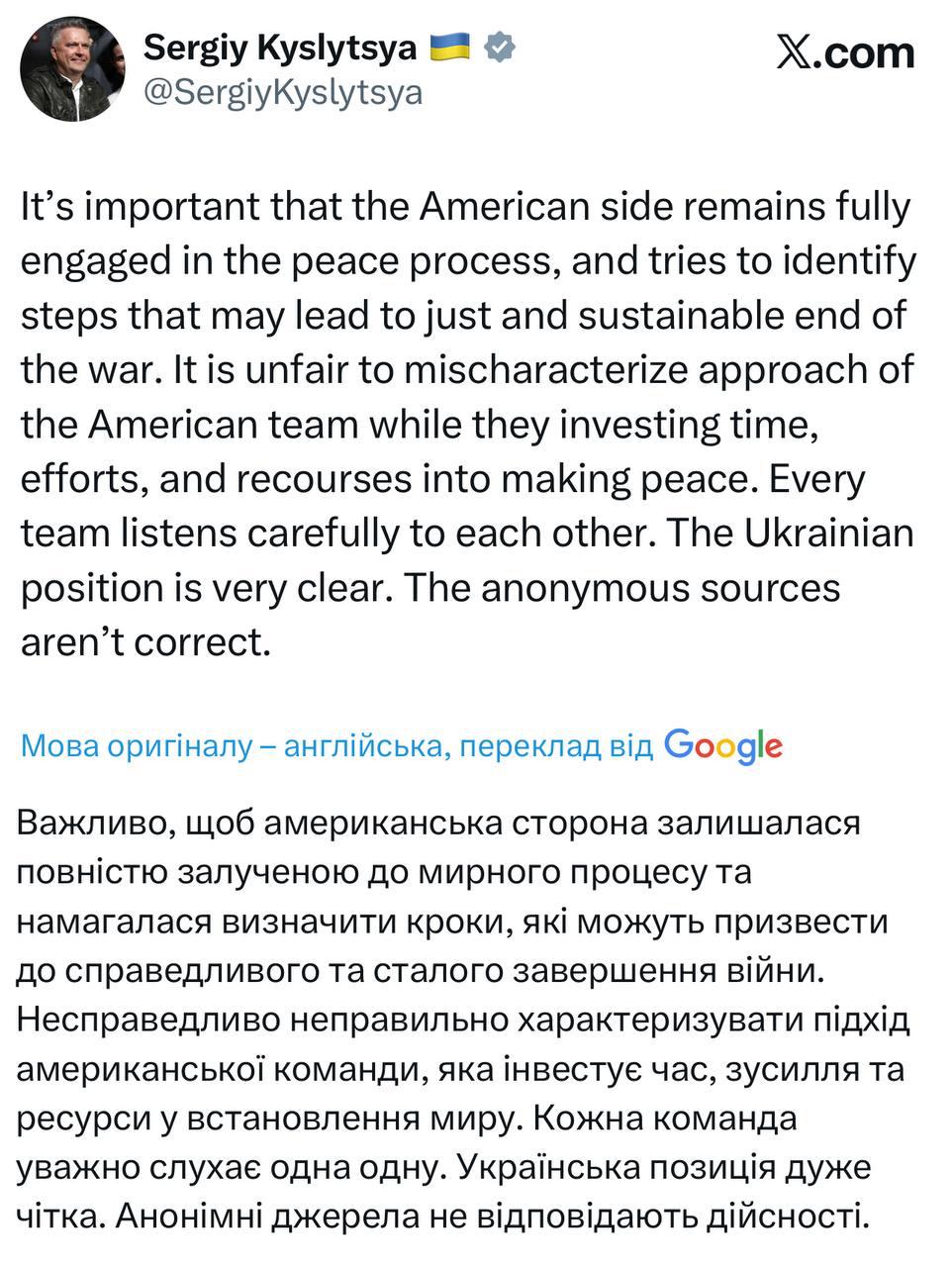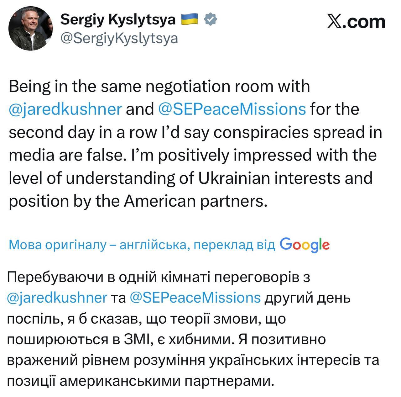 "Перебуваючи в одній переговорній кімнаті з Кушнером і Віткоффом другий день поспіль, я б сказав, що теорії змови, що розповсюджуються в ЗМІ, є хибними. Я позитивно вражений рівнем розуміння інтересів України та позиції американських партнерів. Важливо, щоб американська сторона залишалася повністю залученою до мирного процесу і намагалася визначити кроки, які можуть призвести до справедливого та стійкого припинення війни. Несправедливо спотворювати підхід американської команди, тоді як вони вкладають час, зусилля та ресурси у встановлення миру. Кожна команда уважно слухає одна одну. Позиція України дуже зрозуміла. Анонімні джерела неправильні", - заявив Кислиця.