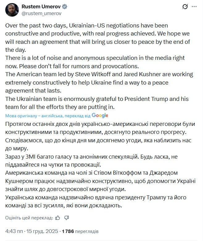 "За останні два дні українсько-американські переговори були конструктивними та продуктивними, досягнуто реального прогресу. Ми сподіваємося, що до кінця дня ми досягнемо угоди, яка наблизить нас до миру", - пише глава переговорної делегації.