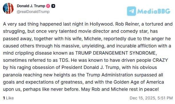 "Роб Райнер — змучений і зазнає труднощів, але колись дуже талановитий кінорежисер і комедійний актор — помер разом зі своєю дружиною Мішель, імовірно через злобу, яку він викликав у оточуючих своєю масштабною, непохитною і невиліковною формою розумово руйнівного захворювання. розуму своєю лютою одержимістю президентом Дональдом Дж. Трампом, а його очевидна параноя досягла нових висот у міру того, як адміністрація Трампа перевершувала всі цілі та очікування величі, а золоте століття Америки наступало — можливо, як ніколи раніше», - написав президент США в соцмережі.