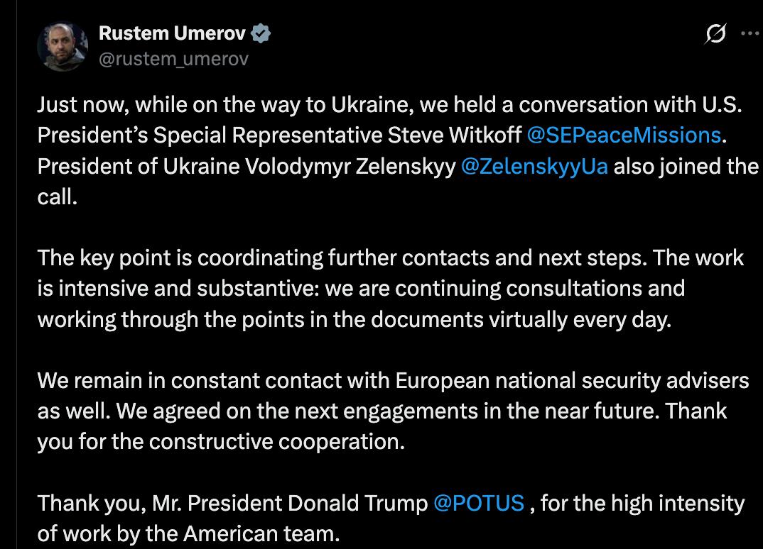 "Щойно на шляху до України ми провели бесіду зі спеціальним представником президента США Стівом Уіткоффом. До розмови також приєднався президент України Володимир Зеленський.