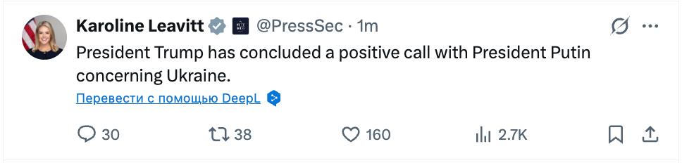 "Сьогодні між російським і американським президентами відбулася чергова телефонна розмова. Дональд Трамп і його ключові радники, які були присутні при цій розмові, детально, в деталях проінформували про основні підсумки вчорашніх переговорів у Мар-а-Лаго з українською делегацією.
