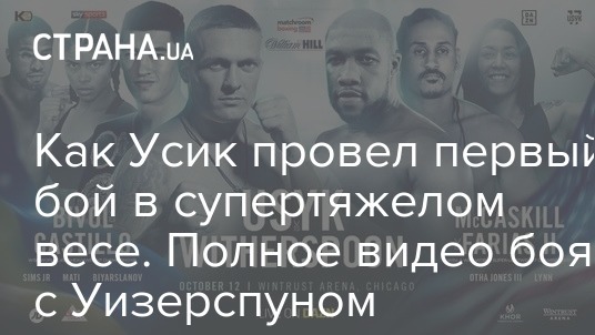 12 октября (13 октября по киевскому времени) в Чикаго состоялся дебютный бой Александра Усика в супертяжелом весе, онлайн которого вела "Страна". Украинский боксер победил уже в седьмом раунде, после того, как команда американца решила остановить бой, опасаясь за здоровье Уизерспуна, который противостоял граду ударов. Это семнадцатая победа Усика на профессиональном ринге.